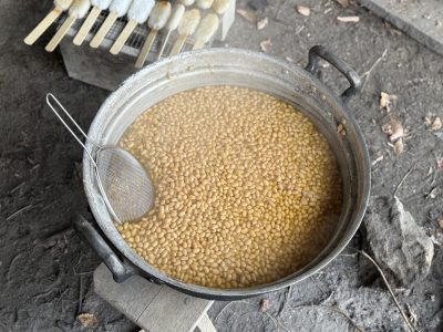 体験では、古民家の庭で焚火をおこし、じっくりと大豆をゆでます。ゆっくりと火を通すことで、大豆は甘くなります。煮ているあいだは、火の番をしたり、周りの景色を楽しみながら、かもすや特製おやつ(おやきやクッキーなど)で一服したり、のんびりと過ごしましょう。